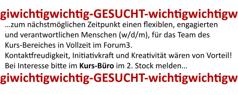 Das Kurs-Büro des Forum 3 sucht zum nächstmöglichen Zeitpunkt einen flexiblen, engagierten und verantwortlichen Menschen (w/d/m), der gut organisieren kann und auch gerne Angebote für junge Menschen entwickeln möchte, für das Team des Kurs-Bereiches in Vollzeit im Forum 3.